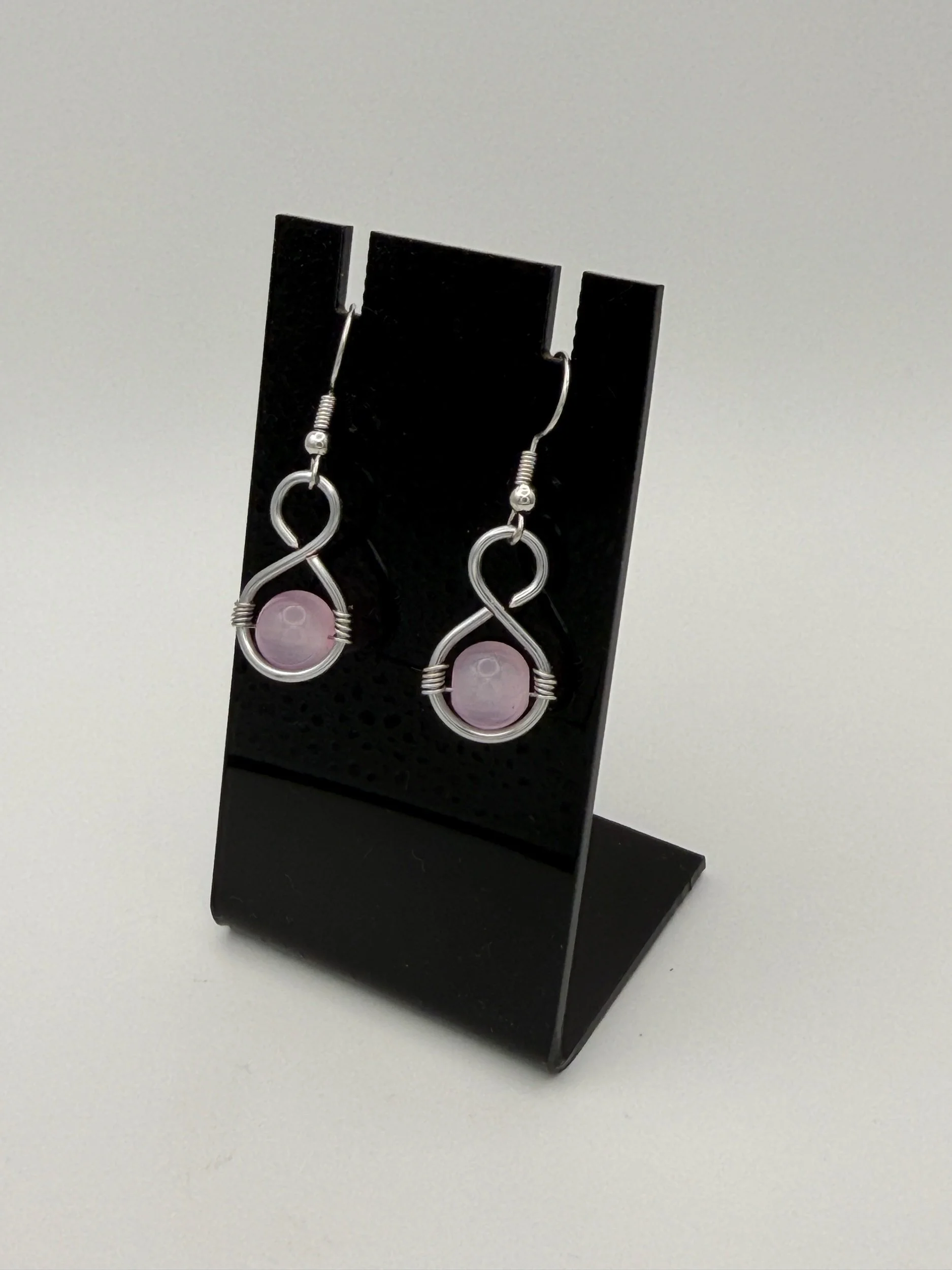 The Infinity Bound earrings feature a hand-wrapped design shaped into a continuous loop, symbolizing connection, balance, and enduring beauty. Each pair is crafted with smooth, polished stone beads and finished with a graceful wire wrap that allows the natural color and character of the stone to shine.