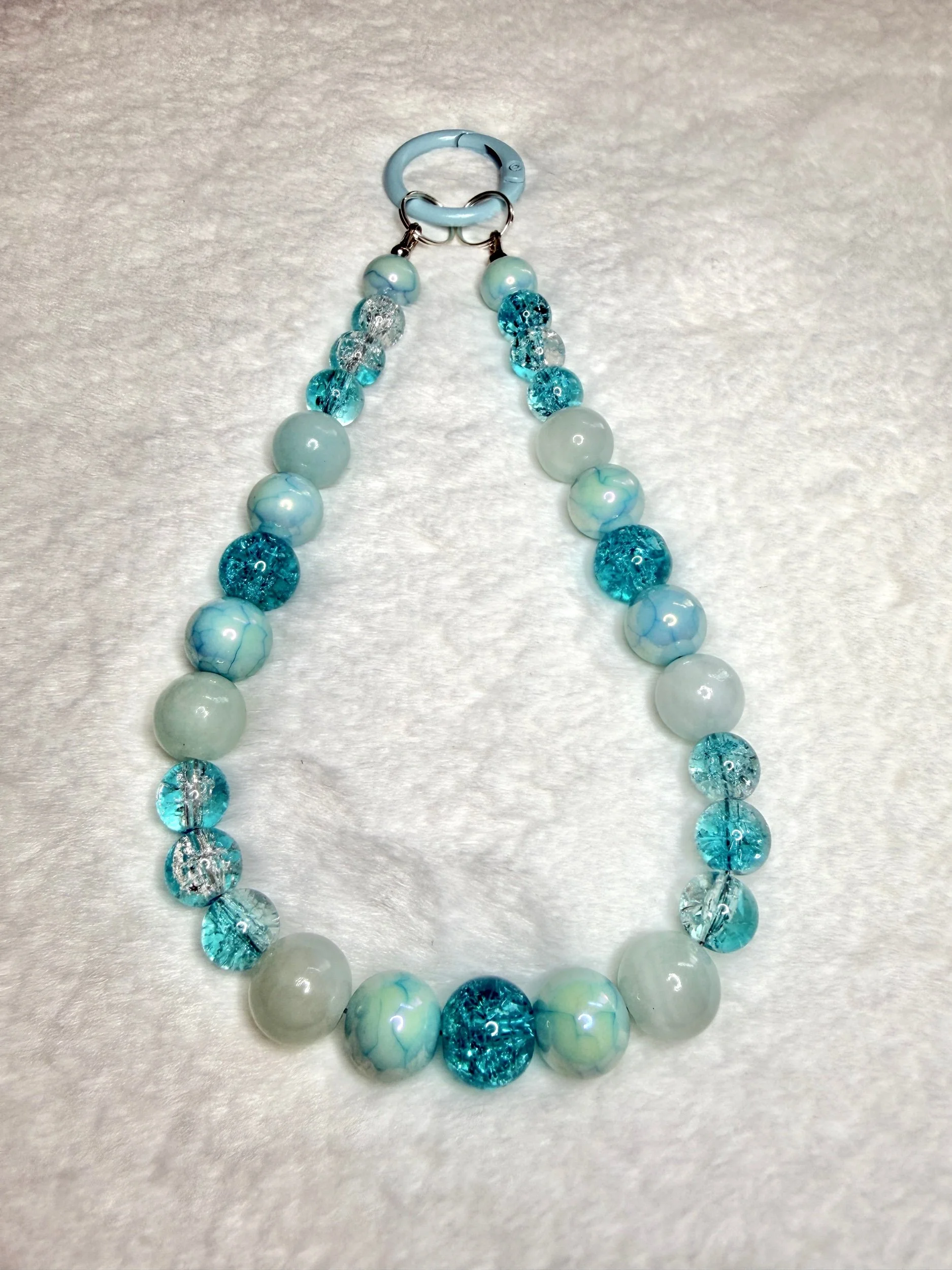 The Glacial Mermaid Charm Loop looks like it was crafted from winter magic and ocean light. Crackled aqua crystals shimmer like frozen waves, while the soft sea-green stones give the strand a cool, calming energy. The marbled icy beads add a dreamy, ethereal glow — like moonlight reflecting off snow.