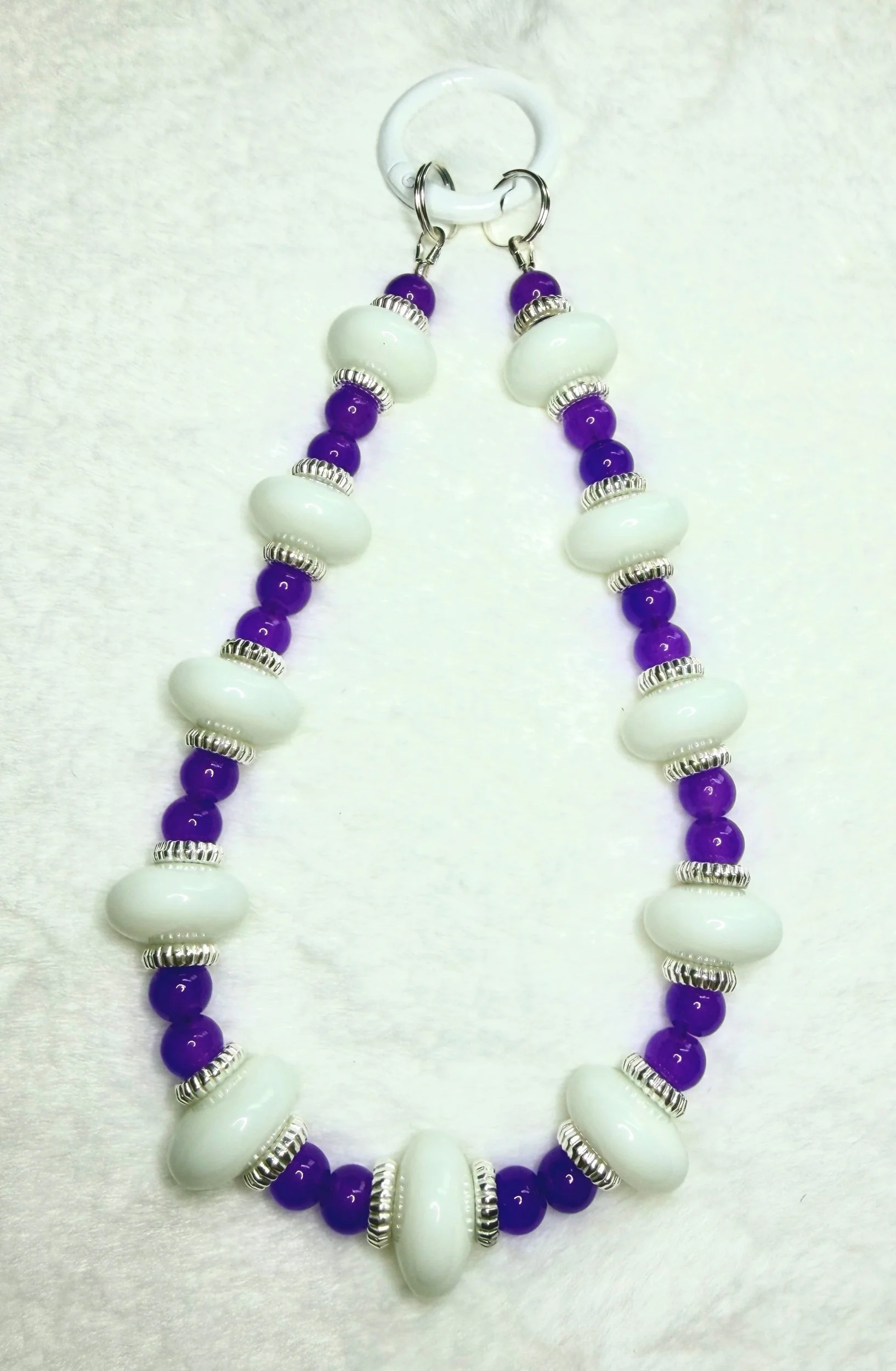 The Enchanted Snowdrop Loop is a striking blend of glossy violet beads paired with smooth, frosted white stones and shimmering silver spacers. The contrast feels crisp, magical, and impossibly elegant — like moonlight touching a field of wild orchids.