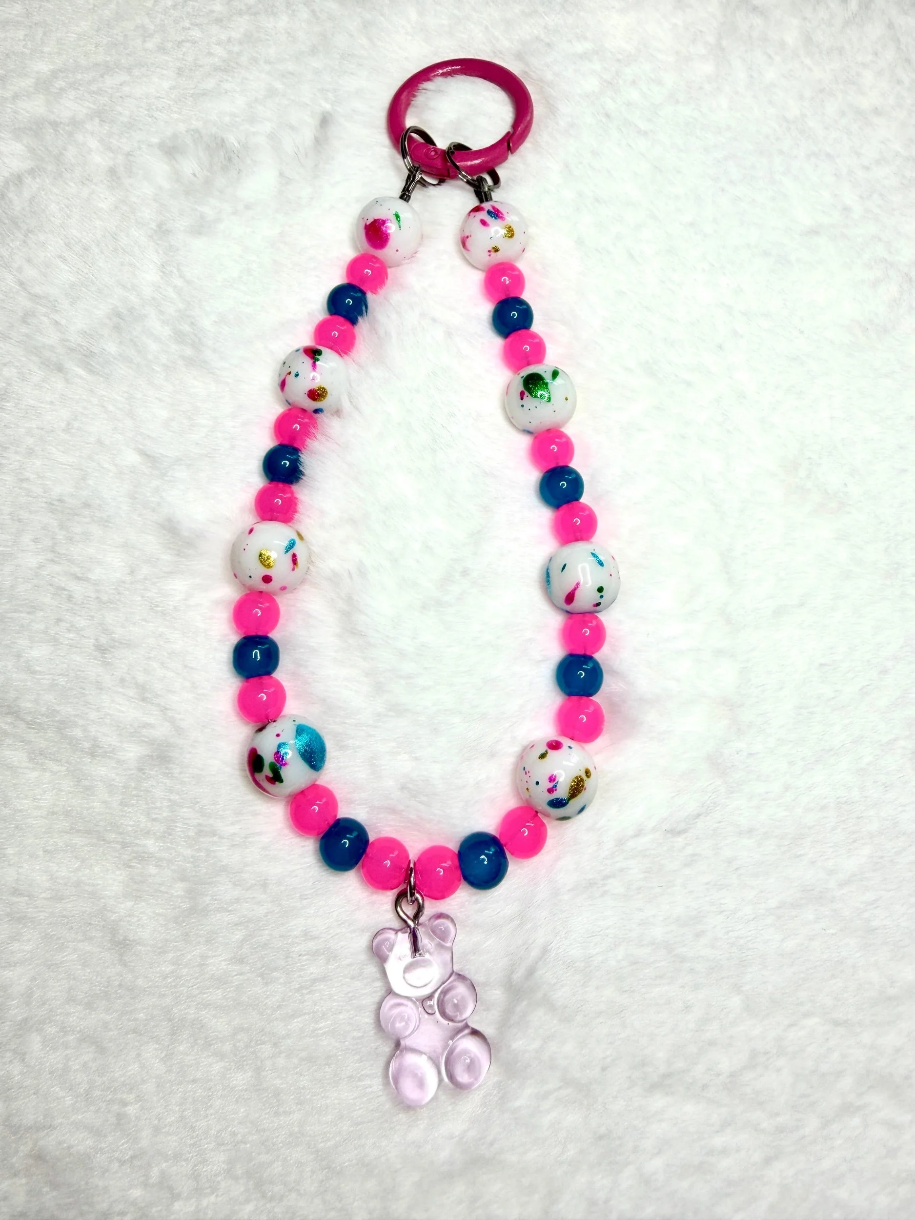 The Bewitched Bubblegum wristlet is a vibrant burst of color and charm, mixing hot-pink beads with deep teal accents and whimsical speckled orbs that look hand-painted by mischievous fae. At the center hangs a translucent gummy-bear charm, like a tiny familiar crafted from enchanted sugar.